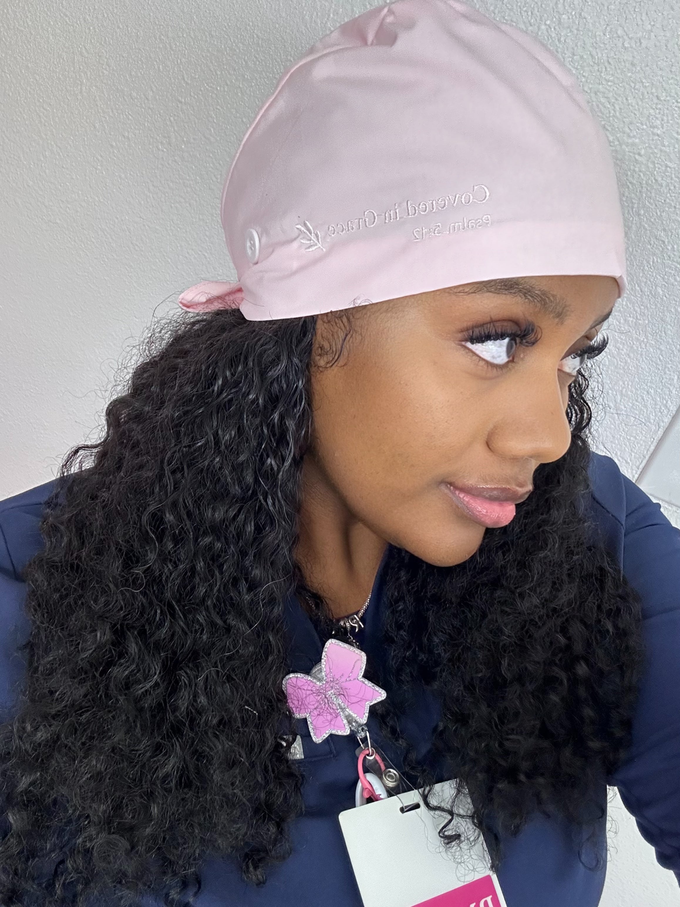 Faith-led, satin-lined scrub caps embroidered with Scripture for those called to care.